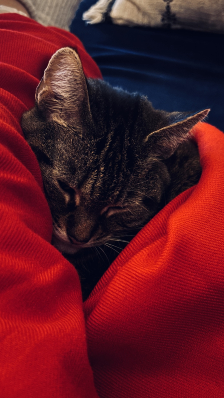 En dan heb ik ook nog mijn katje "Pilou", ze is altijd vlakbij me. Pilou is de Franse naam voor een zachte flanellen stof. Ook wordt het flanellen knooppopje voor babytjes vaak een Pilou genoemd. Zo kreeg mijn bedrijf haar naam.