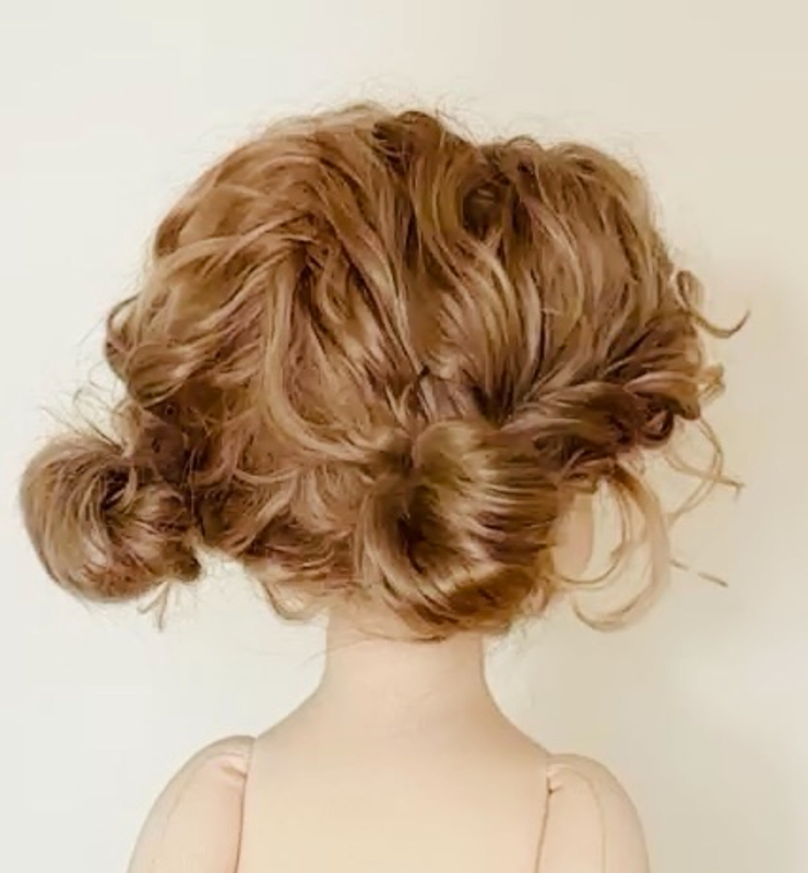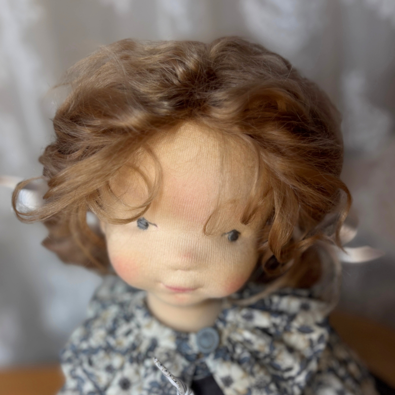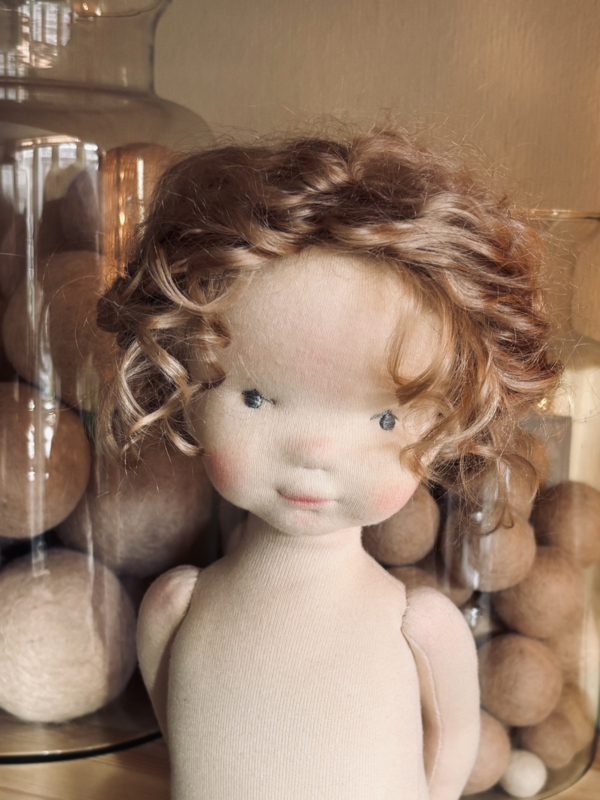 Haar haar is gemaakt van superzachte mohairlokken en mohair/zijde garen in perzikachtig heel licht bruin. Het is het beste om het haar te laten zoals het is, maar indien nodig kan het voorzichtig opnieuw gestyled worden. Een klein mohair borsteltje is inbegrepen.