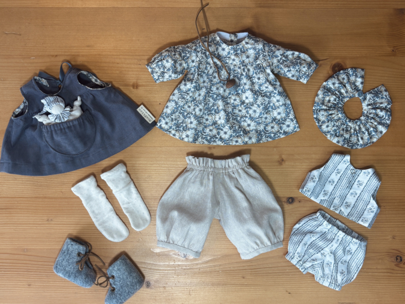 - Een tunique/jurkje met pofmouwen en een losse pierrot kraag. Gemaakt van een recente Liberty stof met bloemen in ecru, beige en de kleur grijs van Annabelle's ogen.